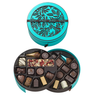 Boite ronde bleue - 26 chocolats et sa barre noir avec personnalisation