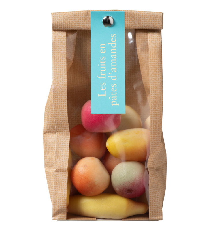 Laissez-vous tenter par ces délicieuses pâtes d’amandes en forme de fruits, joliment présentées dans un sachet kraft.