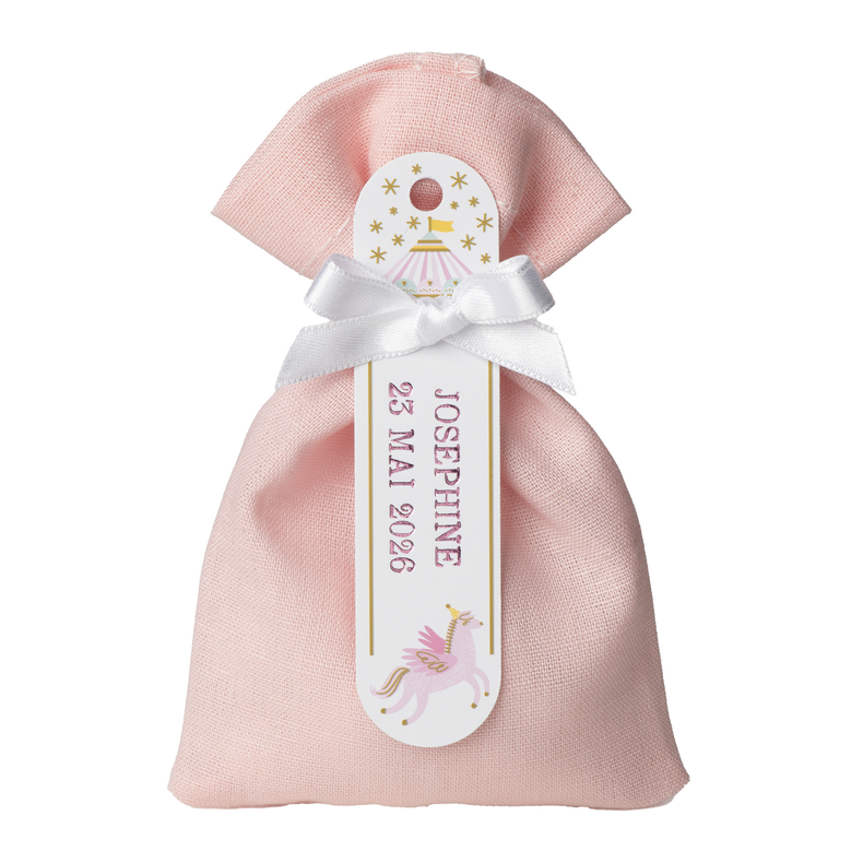 Pochette tissu rose étiquette carrousel Pochette tissu rose étiquette carrousel Couleur : Sélectionner Bleu Rose Je choisis mes dragées