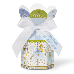 Pour orner votre étui, nous vous proposons également de personnaliser votre ruban décoratif en accédant à un panel de 18 couleurs allant du blanc au beige taupe en passant par le parme et le vert lagon. Selon l’étui sélectionné, ajoutez également un texte de couleur sur le ruban ou bien sur l’étiquette. Au cours de cette étape, il vous suffit de nous transmettre le texte que vous désirez apposer sur l’étui puis de choisir la couleur des caractères. Choisissez enfin le décor qui ponctuera le tout et le tour est joué ! Une fois votre commande passée, les équipes de notre atelier se chargent de préparer vos dragées de baptême dans un délai de 10 jours.