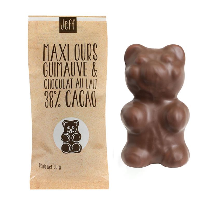 Laissez-vous tenter par notre maxi Ours au cœur tout guimauve enrobée de chocolat au lait ! Trois fois plus grand que notre petit ours classique, il vous apportera trois fois plus de tendresse chocolatée.