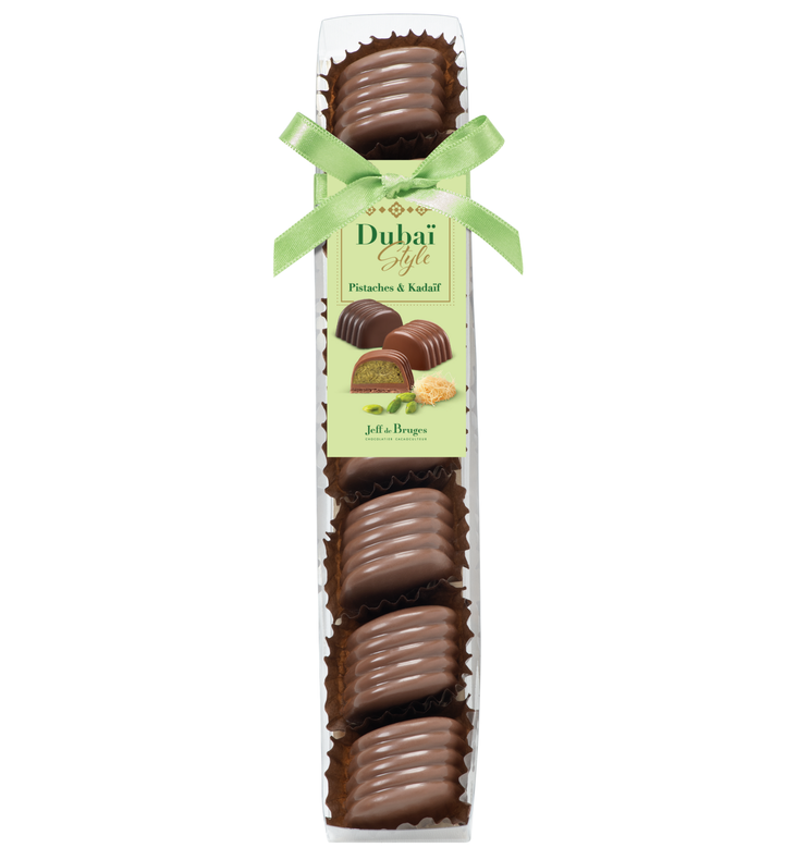 La déclinaison Jeff De Bruges de la recette star du moment débarque dans une réglette de 7 chocolats : 'Dubaï style'.