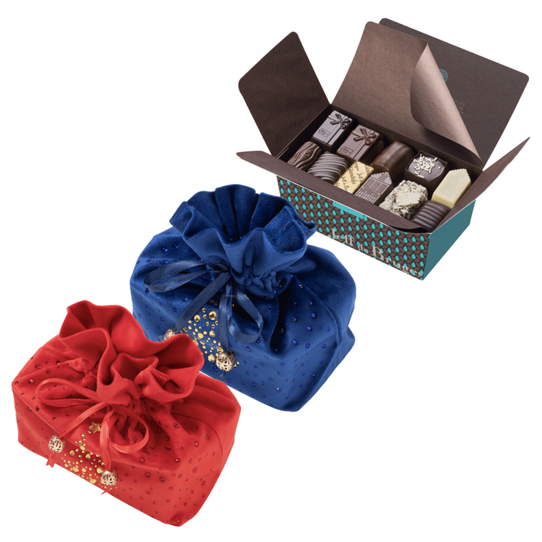 A Noël, sublimez votre ballotin avec une jolie pochette en velours décorée d'un sapin et de flocons en strass, idéale pour les fêtes de fin d'année