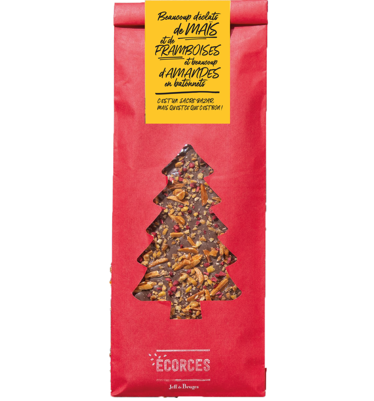 Écorce chocolat au lait, amandes, pépites de maïs et framboises - Édition Noël