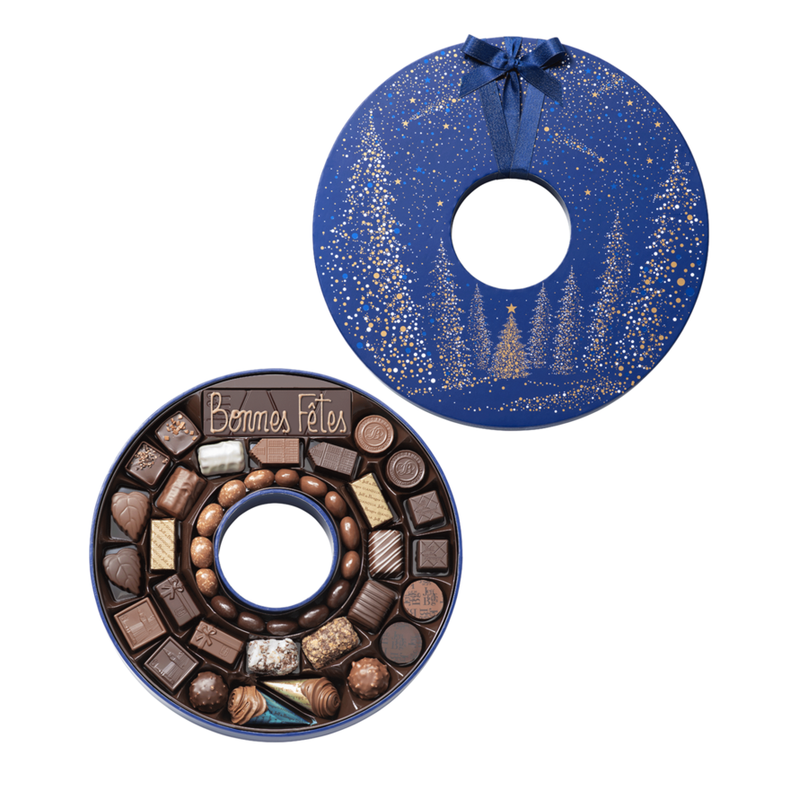 Inspirée par la magie des fêtes, cette boite en forme de couronne de Noël séduit par son allure festive et son contenu généreux. Elle renferme un assortiment raffiné de chocolats fins, sélectionnés pour offrir une palette de saveurs et de textures qui raviront les amateurs de douceurs.
