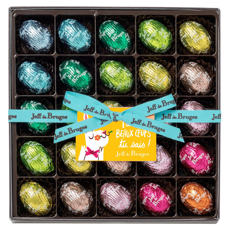 Nos fameux oeufs en chocolat fourrés se retrouvent en boite dans un assortiment coloré !
