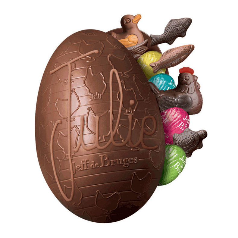 Sophie, Raphaël, Louve, Louis… vous avez la possibilité de faire personnaliser vos oeufs de Pâques en écrivant les prénoms de votre choix. Ce bel oeuf en chocolat au lait 36% cacao d’Équateur garni de délicieuses gourmandises rendra à coup sûr la chasse aux oeufs 2024 mémorable ! À chacun son oeuf, grâce à la personnalisation le cadeau devient unique.