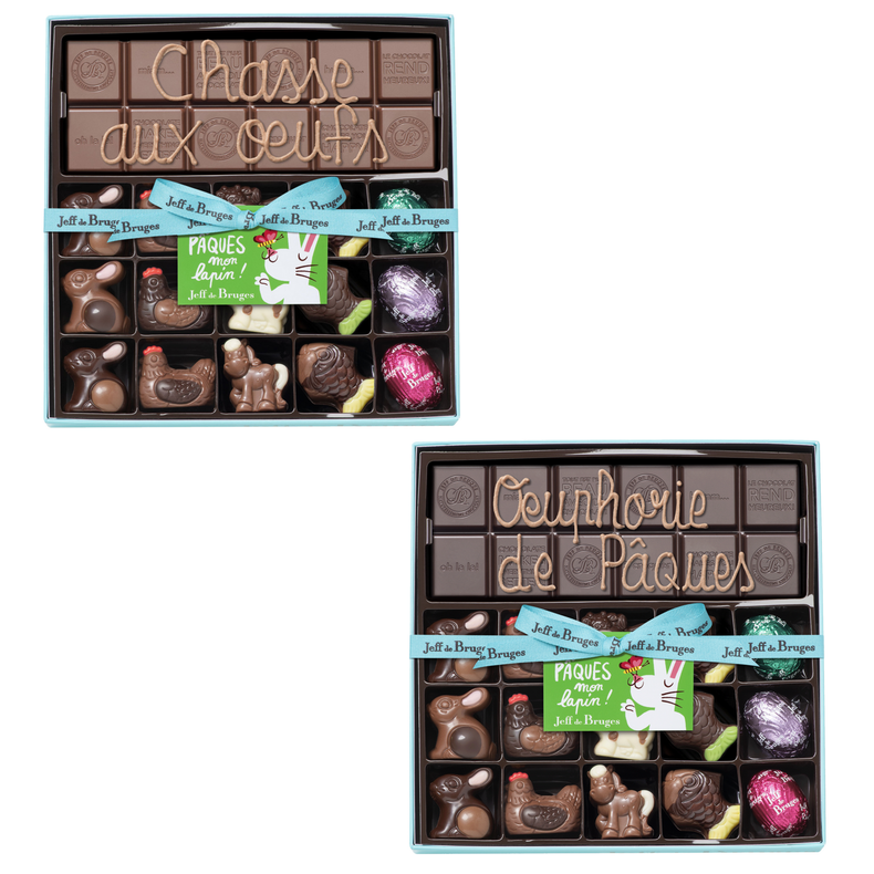 Dans cette boite composée de 15 chocolats de pâques, vous aurez un large choix de praliné ! L’effet de surprise sera garanti lorsque vous dégusterez les petits oeufs fourrés ou croquerez dans le décor des animaux de Pâques.