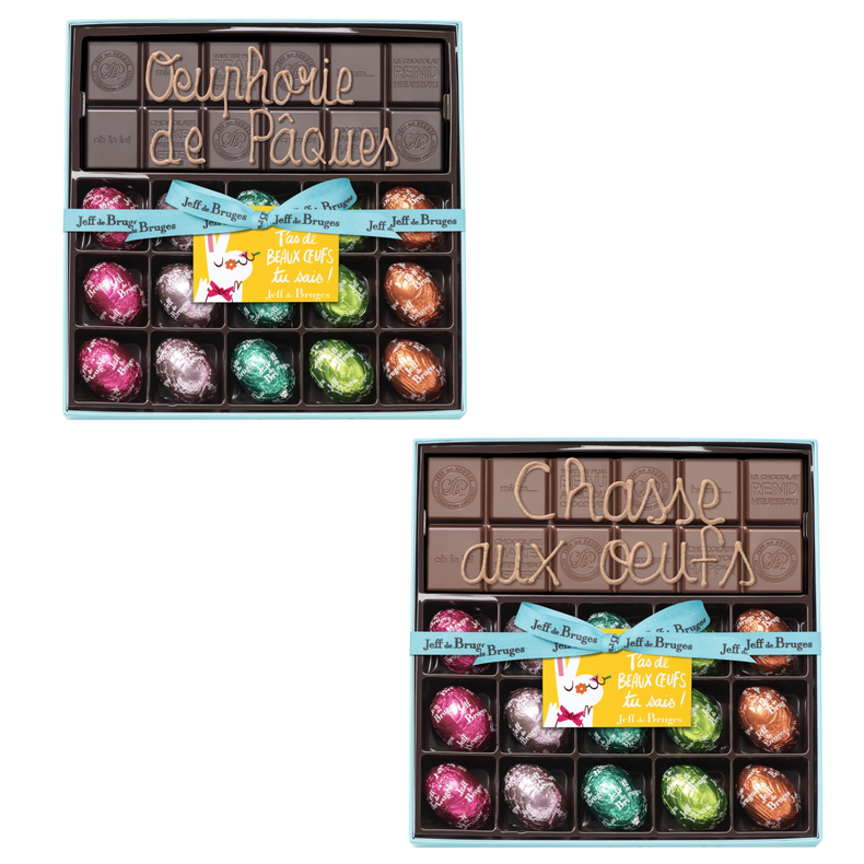 Dans cette boite composée de 15 oeufs fourrés au décor coloré, vous aurez un large choix ! L’effet de surprise sera double : avec l’enrobage en chocolat au lait ou noir puis le fourrage praliné ou la ganache qui se cache à l’intérieur de ces petits oeufs.