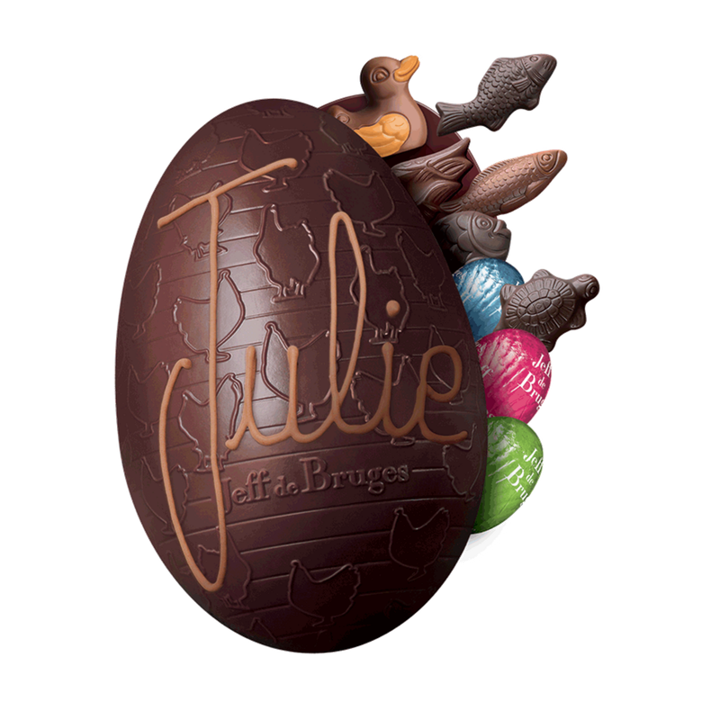 Sophie, Raphaël, Louve, Louis… Nous personnalisons vos oeufs de Pâques en écrivant les prénoms de vos poussins ! Ce bel oeuf en chocolat noir 59% cacao d’Équateur garni de délicieuses gourmandises rendra à coup sûr la chasse aux oeufs mémorable ! A chacun son oeuf, grâce à la personnalisation le cadeeau devient unique.