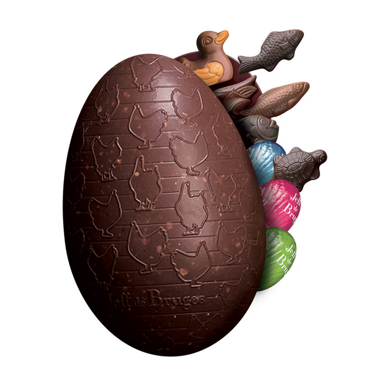 Animaux et sujets en chocolat fourrés – Ingrédients : Fourrage (sucre, NOISETTES 32%, beurre de cacao, LAIT entier en poudre, pâte de cacao, sirop de glucose, LAIT entier condensé sucré, eau, AMANDES, émulsifiant : lécithine, noix de coco, crème (LAIT), farine de BLÉ, beurre (LAIT), farine de riz, beurre concentré (LAIT), sel, sucre caramélisé, sirop de sucre inverti, LACTOSE (LAIT), arôme, LAIT écrémé en poudre, matière grasse laitière (LAIT), malt d'ORGE, dioxyde de carbone) - Chocolat au lait (sucre, LAIT entier en poudre, masse de cacao (fèves de cacao origine Équateur), beurre de cacao, émulsifiant : lécithine) - Chocolat noir (masse de cacao (fèves de cacao origine Équateur), sucre, beurre de cacao, matière grasse laitière (LAIT), émulsifiant : lécithine) - Chocolat blanc (sucre, beurre de cacao, LAIT entier en poudre, émulsifiant : lécithine, arôme) - Décoration (sucre, beurre de cacao, LAIT entier en poudre, pâte de cacao, émulsifiant : lécithine, matière grasse laitière (LAIT), aliments colorants (concentrés de betterave rouge, de paprika et de spiruline), colorant : curcumine, arôme).
