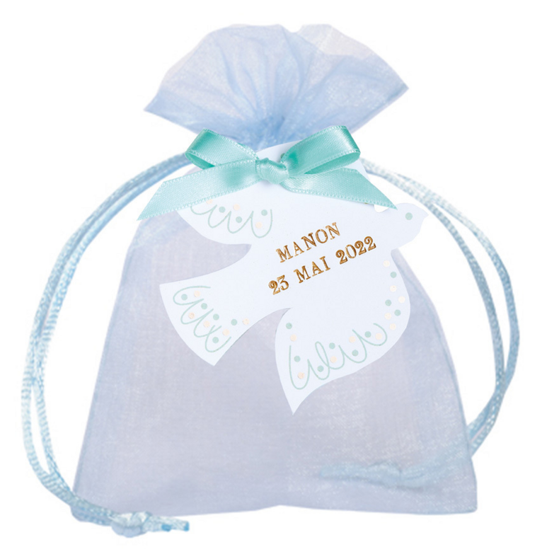 POCHETTE ORGANDI ETIQUETTE COLOMBE BLEU CIEL POCHETTE ORGANDI ETIQUETTE COLOMBE BLEU CIEL Couleur : Blanc Je choisis mes dragées