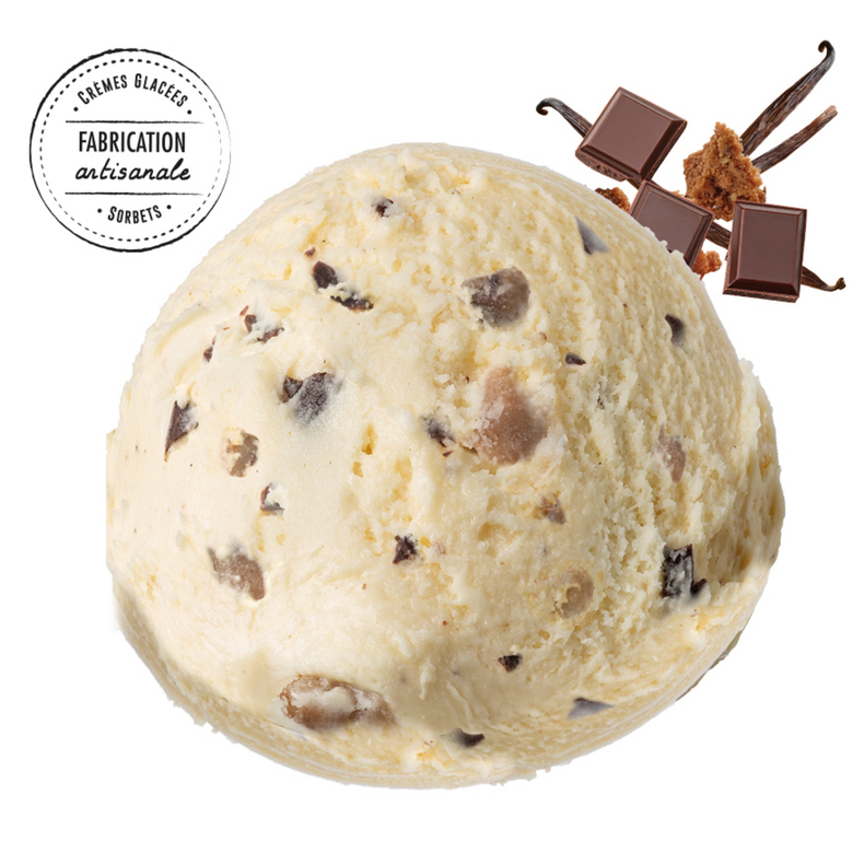 La crème glacée à la vanille, douce et onctueuse, sert d’écrin à de généreux morceaux de pâte à biscuit crue, fondants et savoureux. Les pépites de chocolat viennent ponctuer chaque bouchée d’une touche croquante et intensément chocolatée.