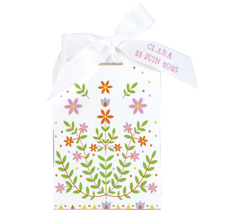 Petite pochette blanche, impression multicolore avec un ruban à personnaliser.