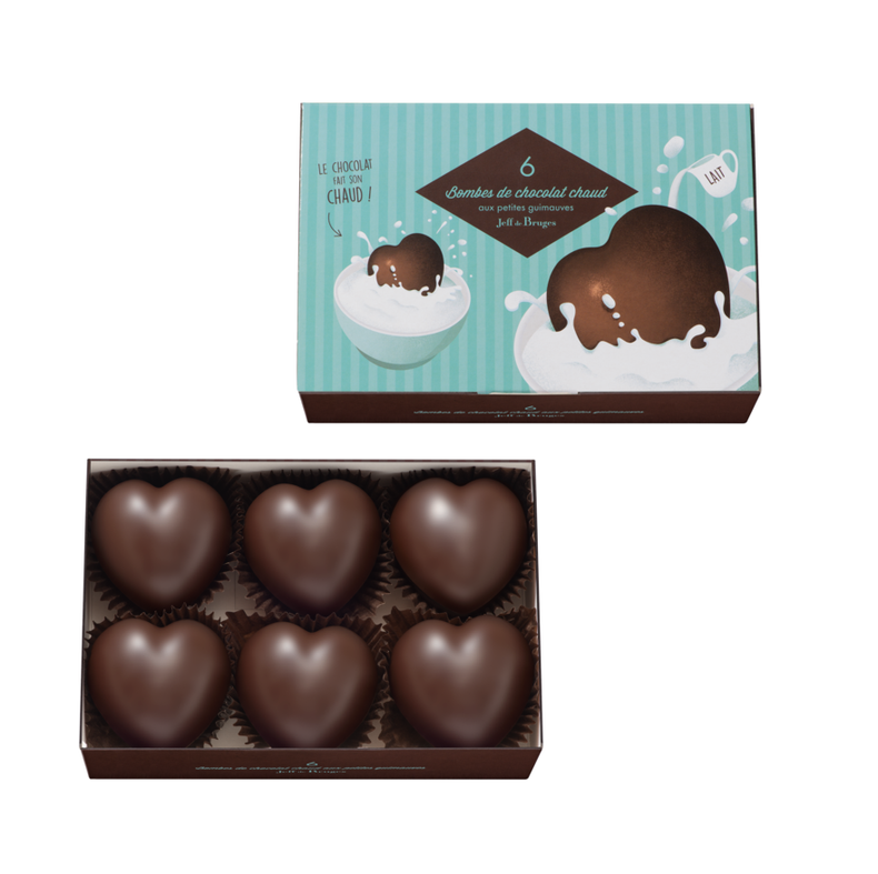 Box of 6 dark chocolates hearts bomb and its small marshmallows by Jeff de Bruges