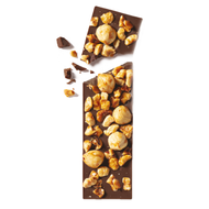 Dark chocolate bar with caramelised hazelnuts. Ingredients: dark chocolate 74% (cocoa mass (cocoabeans from Ecuador), sugar, cocoa butter, emulsifier: lecithins (SOYA),natural vanilla flavouring), caramelised HAZELNUTS 25% (HAZELNUTS,sugar, glucose syrup, honey). Dark chocolate: 60% cocoa minimum.