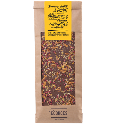Milk CHOCOLATE SLAB WITH caramelized ALMOND STICKS, CORN AND RASPBERRYCHIPS.