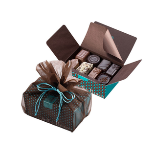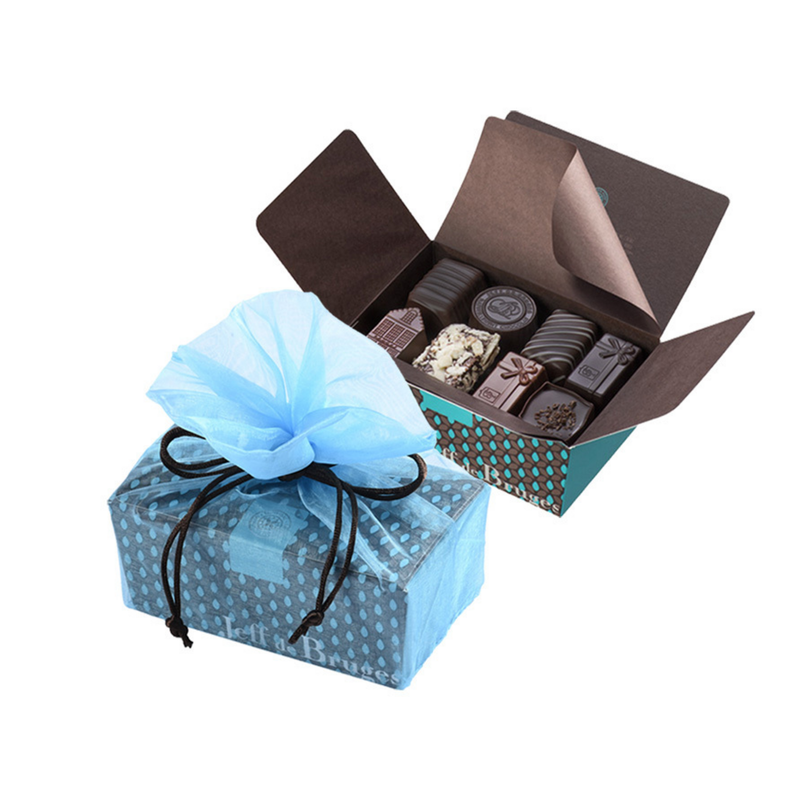 Enhance your 250 g ballotin (approximately 21 chocolates) with an attractive blue organdie pouch. Find out more