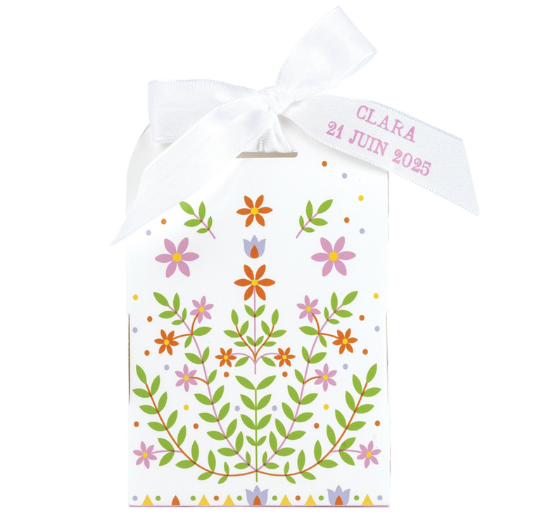 Small white pouch, multicoloured print with ribbon to personalise.