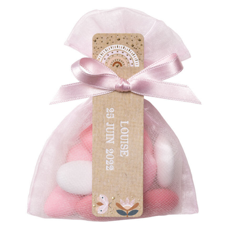 ORGANDY pouch WITH PINK RAINBOW LABEL ORGANDY pouch WITH PINK RAINBOW LABEL Color: Select White Light pink Fuchsia pink Please select product features I choose my dragees
