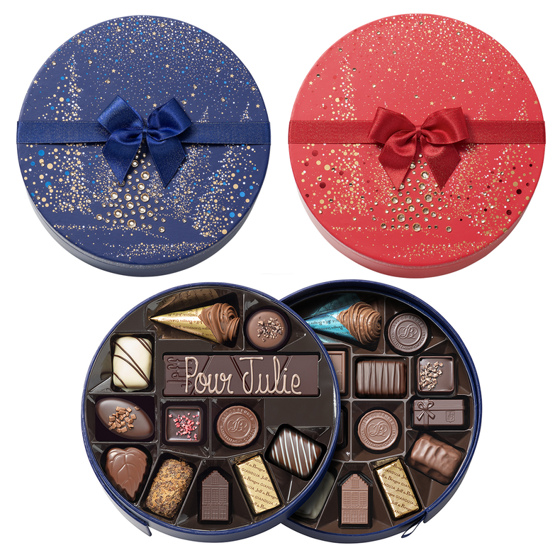 Red or blue round Christmas Box – 25 Assorted Chocolates and Gourmet Bar