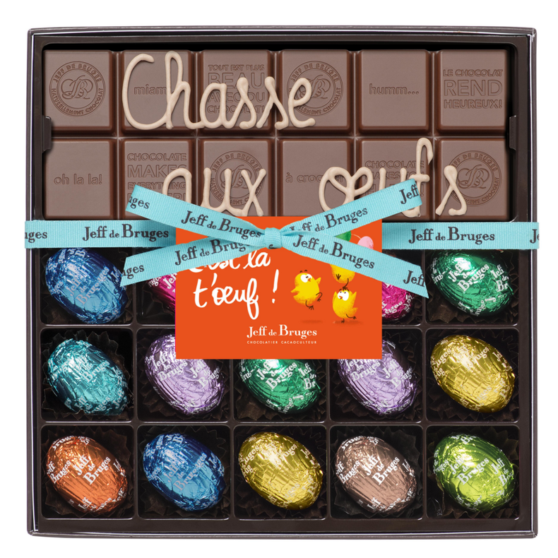 Assorted filled chocolate eggs – Ingredients: milk chocolate (sugar, whole MILK powder,cocoa mass (cocoa beans from Ecuador), cocoa butter, emulsifier: lecithins (SOYA),natural vanilla flavouring), dark chocolate (cocoa mass (cocoa beans fromEcuador), sugar, condensed butter (MILK), cocoa butter, emulsifier:lecithins (SOYA), natural vanilla flavouring), sugar, white chocolate(sugar, cocoa butter, whole MILK powder, emulsifier:lecithin, natural vanilla flavouring), HAZELNUTS, cocoa mass, cocoabutter, shea butter, coconut fat, ALMONDS, sunflower oil, crispycrepe chips (WHEAT flour, sugar, condensed butter (MILK), LACTOSE (MILK), MILK proteins,salt, malted barley flour, raising agent: sodium carbonates), cream (MILK),stabilizer: sorbitol, humectant: glycerol, defatted cocoa powder,coconut, glucose syrup, WHEAT flour, sparkling sugar(sugar, glucose, cocoa butter, LACTOSE (MILK), acidityregulator: malic acid, carbon dioxide), whole MILK powder,condensed butter (MILK), natural vanilla, orange, caramel and hopflavourings, dextrose, cocoa powder, butter (MILK), emulsifier:lecithins (SOYA), skimmed MILK, EGG, WHEAT starch,honey, salt, raising agent: ammonium and sodium carbonates, Guérandesalt, caramelized sugar, rice starch. May contain traces of sesameseeds, peanuts and other nuts.