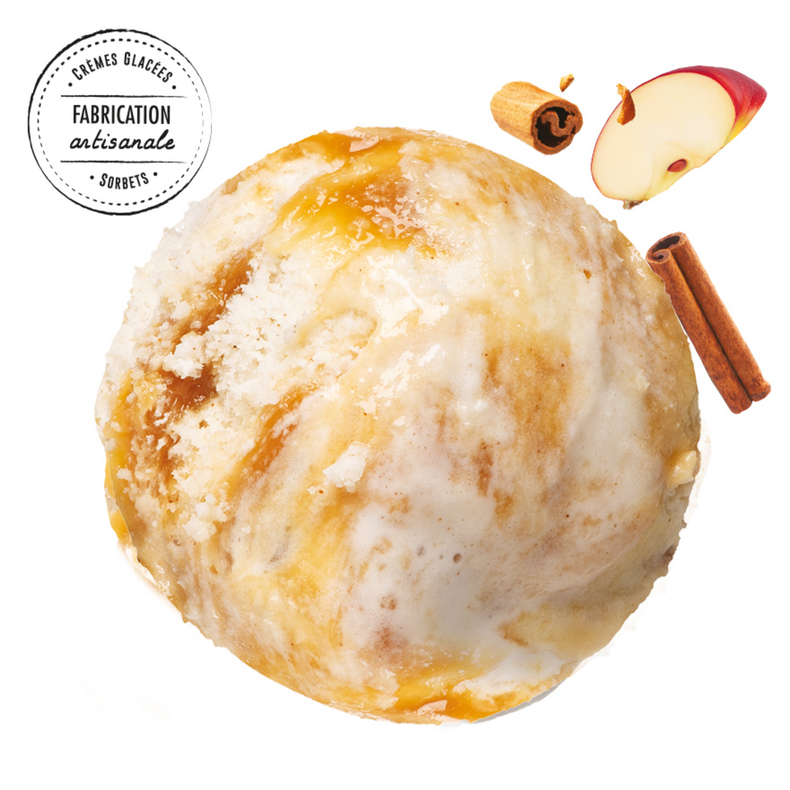 Golden apple pieces in a delicate caramel add fruity sweetness and a hint of tartness. The cinnamon, subtle but present, wraps each bite in a warm scent. To top it all off, a crunchy crumble adds a gourmet texture that contrasts perfectly with the freshness and sweetness of the ice cream.