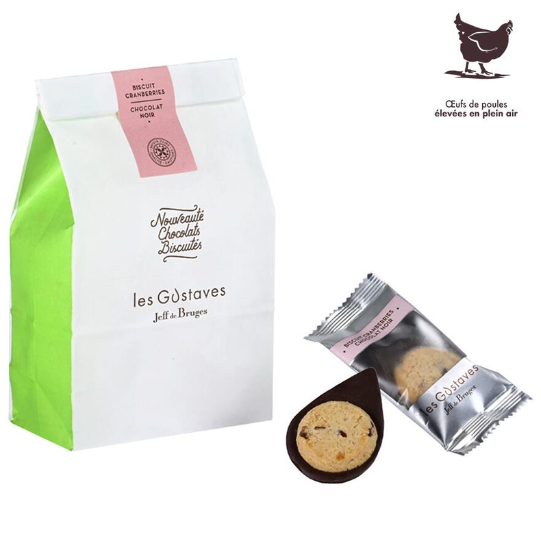 An artisanal shortbread biscuit with dried cranberries on a thin melting and tasty 60% cocoa dark chocolate petal Find out more