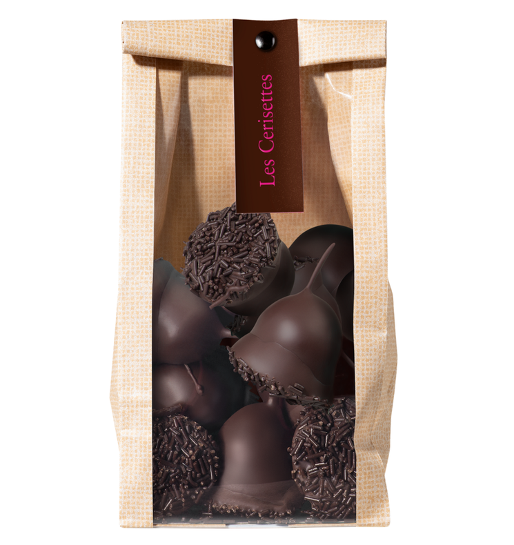 Jeff de Bruges cerisettes? A true delight! It’s time to taste these whole cherries macerated in Kirsch, coated in dark chocolate! Whole cherries contain pits. Cherry stems made of non-edible plastic.