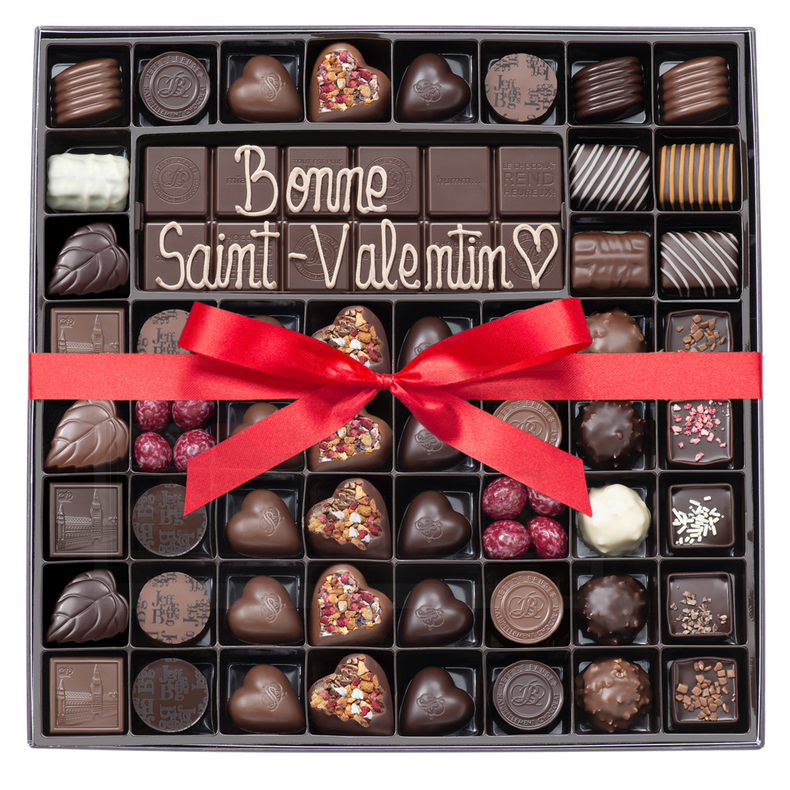 Box of 54 Valentine's Day chocolates and dark chocolate bar with customization
