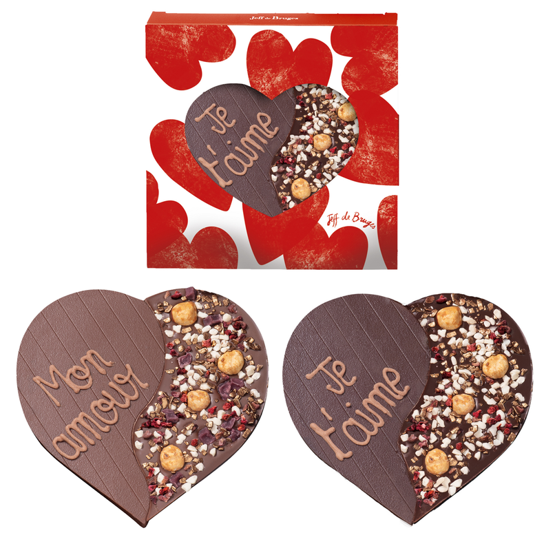 A pretty box full of love and chocolate! A heart decorated with salted caramelised pecans, blueberry slivers, redcurrants and bronze flakes. The perfect gift for an exceptional Valentine's Day. Personalise your heart to declare your love, ask for forgiveness, unleash passions or simply share good times.
