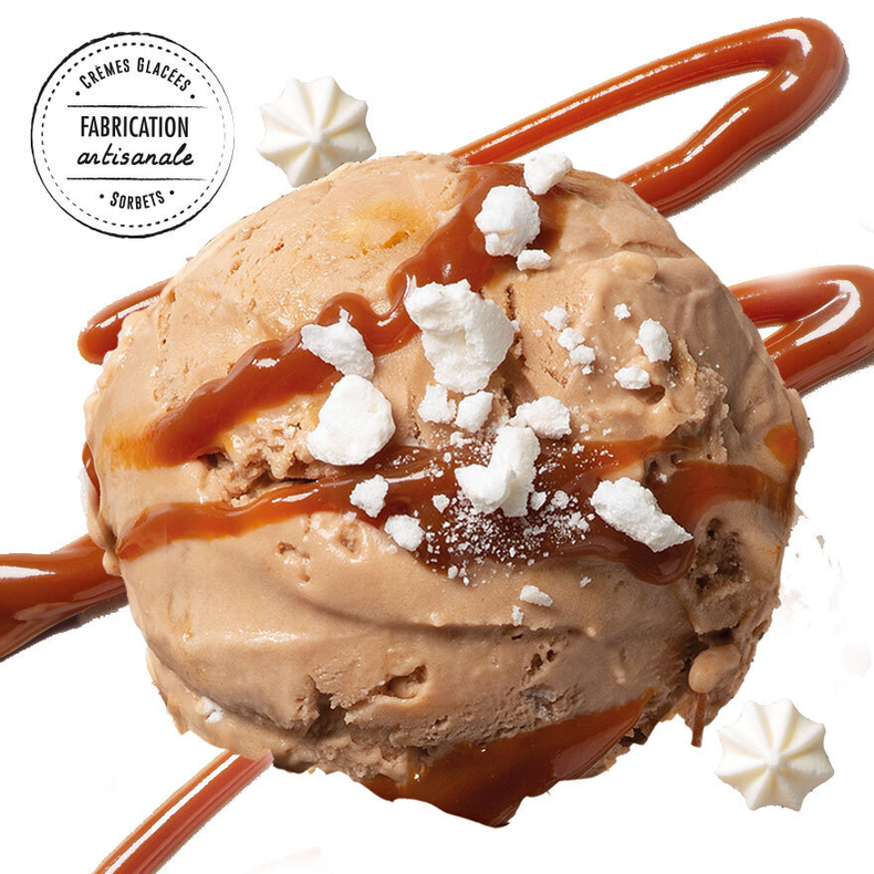 Une crème glacée chocolat au lait au goût lactée avec des morceaux de meringue croquants et addictifs agrémentés d'un filet de caramel fondant.