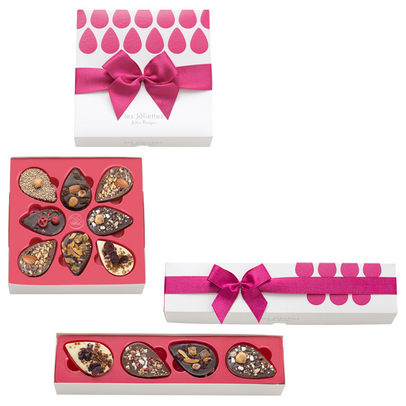 Avec cette jolie boîte façon «pâtissier» et son ruban rose argenté, découvrir nos 7 Juliettes et plus particulièrement nos 2 nouvelles recettes de Noël sera un plaisir. L'alliance subtile d'un fin pétale de chocolat et de fruits secs généreusement parsemés ne laissera personne indifférent.