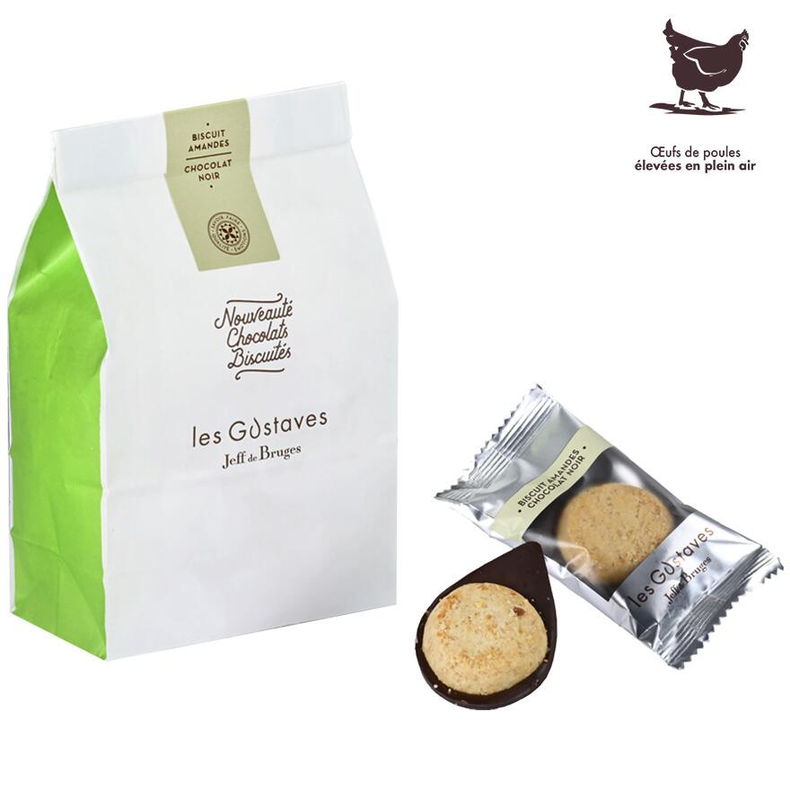 Ingrédients : biscuit aux amandes (farine de froment (BLÉ), beurre (LAIT), sucre de canne, AMANDES, LAIT entier en poudre, ŒUFS entiers, amidon de maïs, émulsifiant : lécithine (SOJA), extrait de romarin (huile de colza, romarin), poudre à lever : bicarbonate de sodium, fleur de sel, arôme), chocolat noir (masse de cacao aux fèves d'Équateur, sucre, cacao maigre en poudre, matière grasse laitière anhydre (LAIT), beurre de cacao, émulsifiant : lécithine (SOJA)). Chocolat noir 60% cacao minimum.