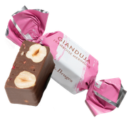 Deux noisettes au coeur d'un gianduja au chocolat au lait... des éclats de framboise acidulée apportent une touche fruitée et vibrante, contrastant délicieusement avec la douceur du gianduja. Quelques brisures de meringue croustillante viennent compléter cette symphonie de textures, offrant une légèreté aérienne et une pointe de sucre croquant...