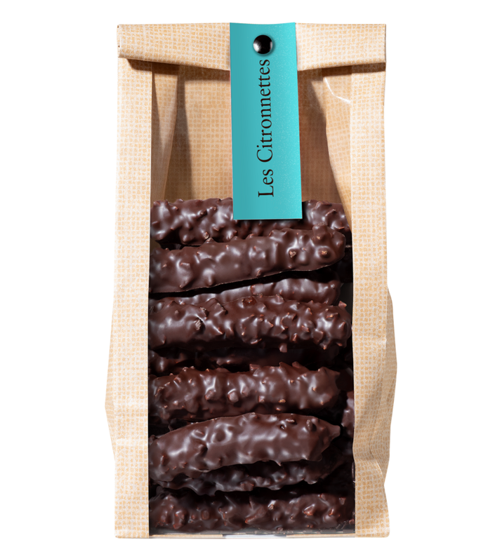Découvrez notre sachet garni de citronnettes enrobées de chocolat noir 60 % de cacao origine Équateur.