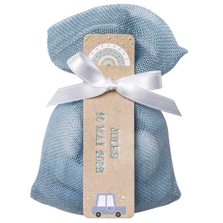 Pochette en lin bleue ornée d'un ruban satin et d'une étiquette pouvant être imprimée