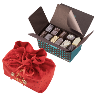 Boite de Noël carrée rouge - 32 chocolats assortis et sa barre gourmande sans personnalisation