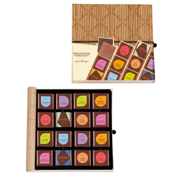 40 carrés, disposés dans un joli coffret en bambou, que vous pourrez déguster lors d’une pause gourmande bien méritée. Jeff de Bruges compose un assortiment Dégustation de saveurs différentes, aux alliances originales, fruitées et cacaotées parmi lesquelles : chocolat noir et éclats de framboise, chocolat au lait aux éclats de caramel au beurre salé d'Isigny, chocolat noir et éclats de citron vert....