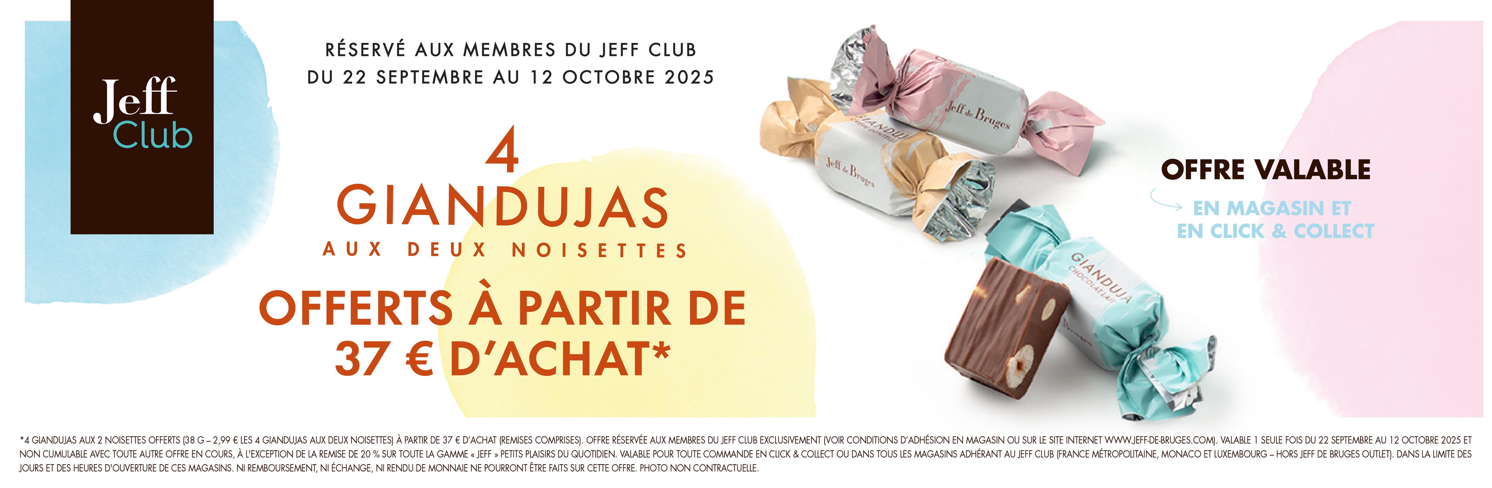 Toutes nos offres sont valables dans les magasins Jeff de Bruges de France métropolitaine, de Monaco et du Luxembourg (hors Jeff de Bruges outlet).